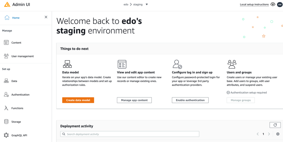 フロントエンドウェブおよびモバイルのデベロッパーが、AWS によるスケーラブルなフルスタックアプリケーションをビルドできるようにし、数分の内にバックエンドを構成しアプリケーションと接続でき、また、静的なウェブアプリケーションのデプロイは数クリックだけで実行できます。さらに、AWS コンソールの外部でも、簡単にアプリケーションコンテンツの管理が行えます。