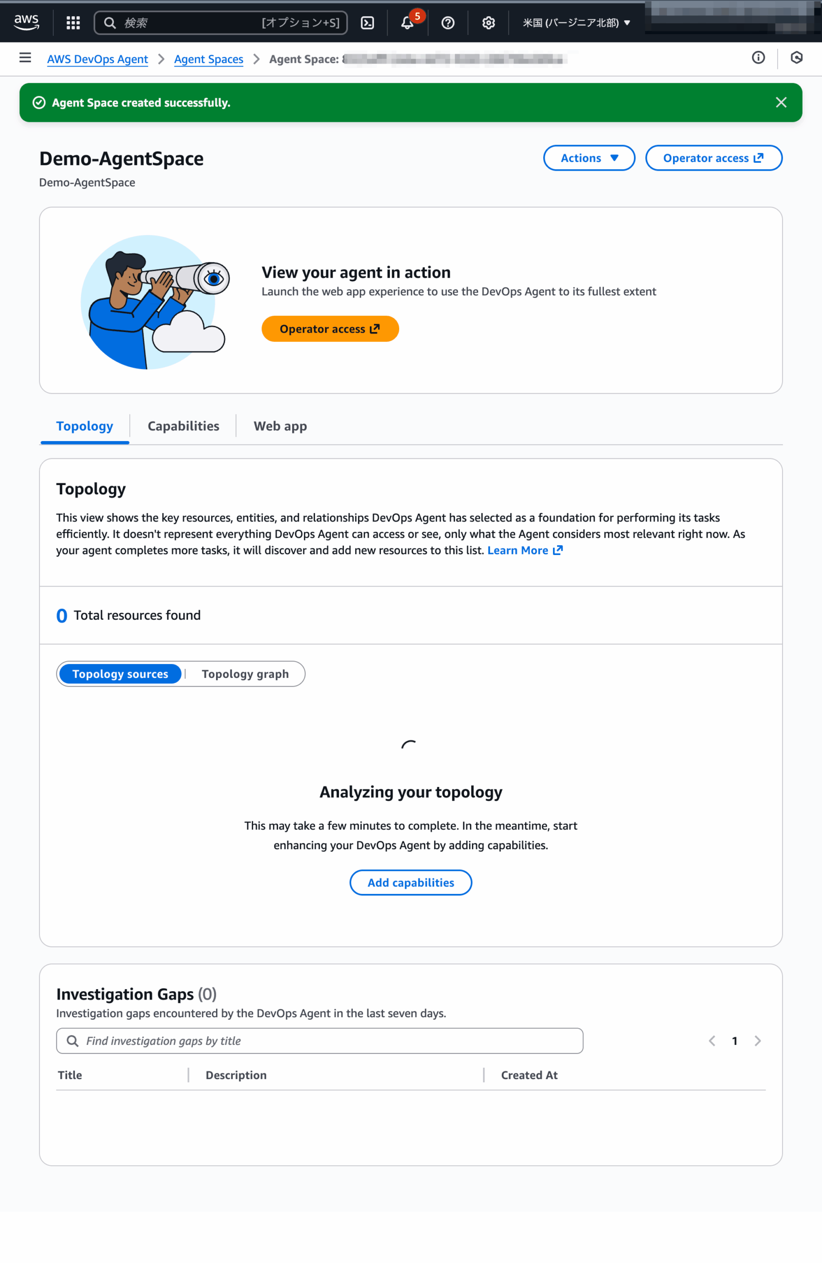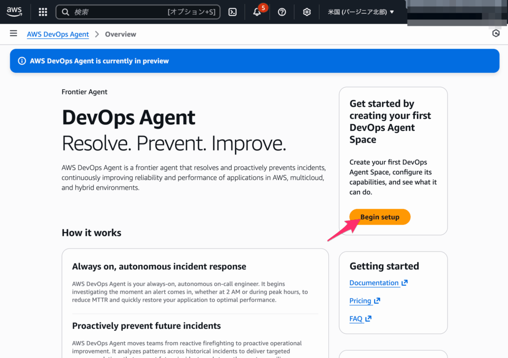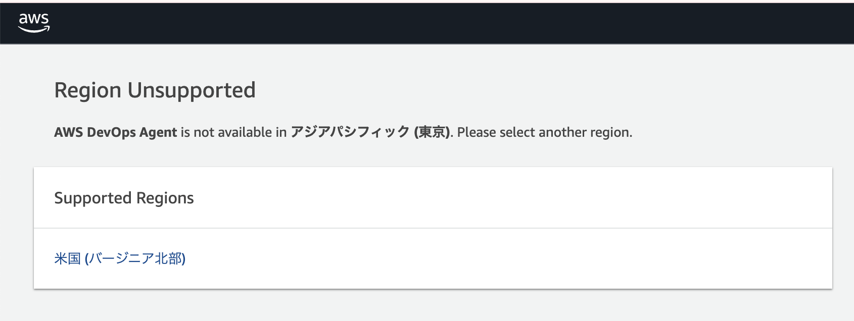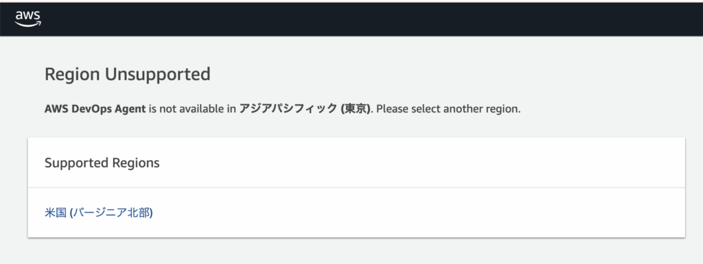 2025年12月中旬現在、東京リージョンでAWS DevOps Agentを開くとこのような画面になります。