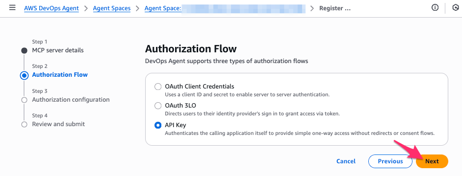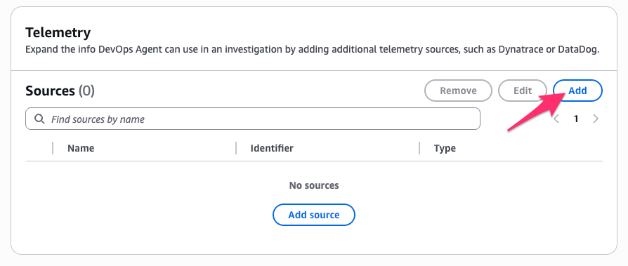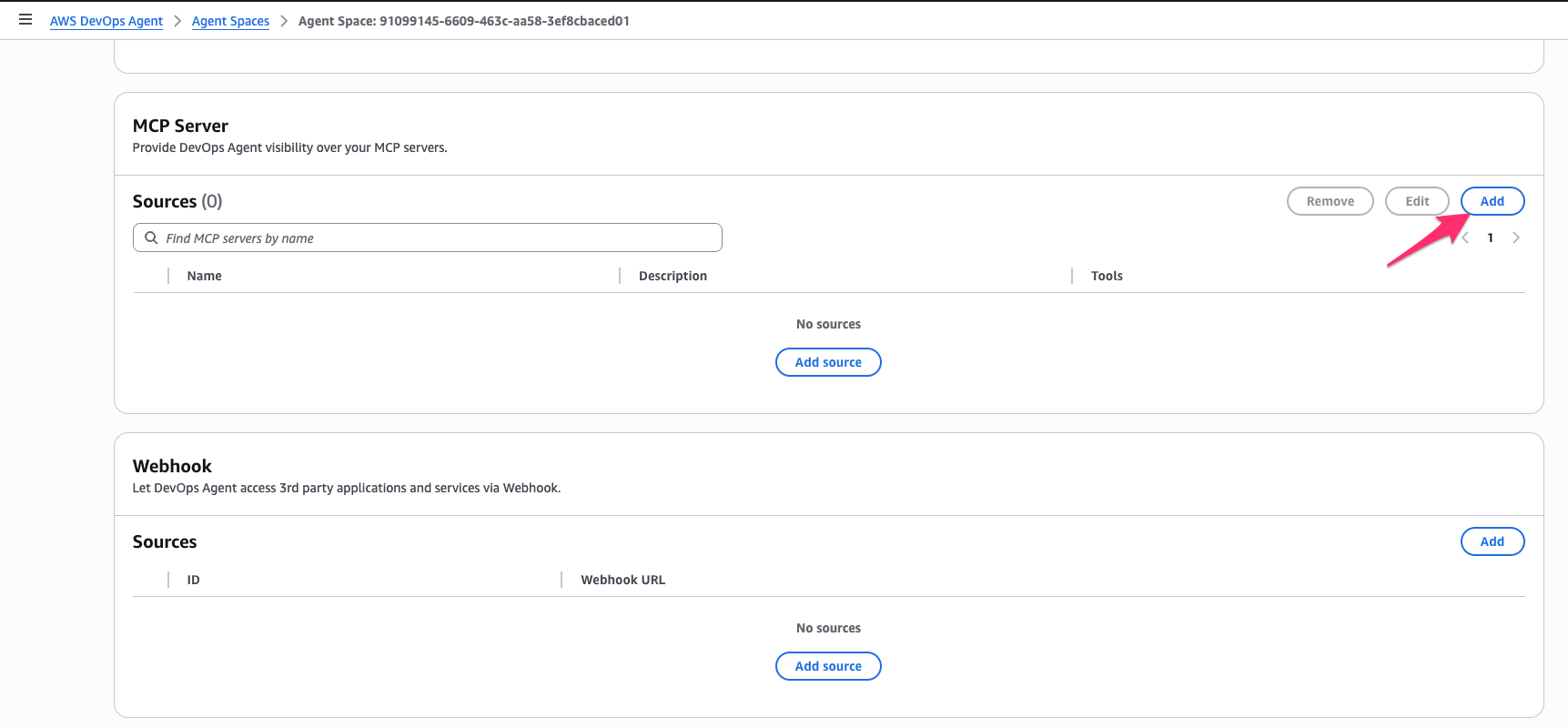 DevOps Agent - Capabilities の画面から、「MCP Server」の「Add」を押下して、