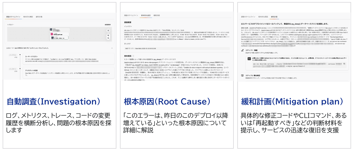- 人間が状況を聞く前に、裏側でログやメトリクス、変更履歴を横断して分析してくれる