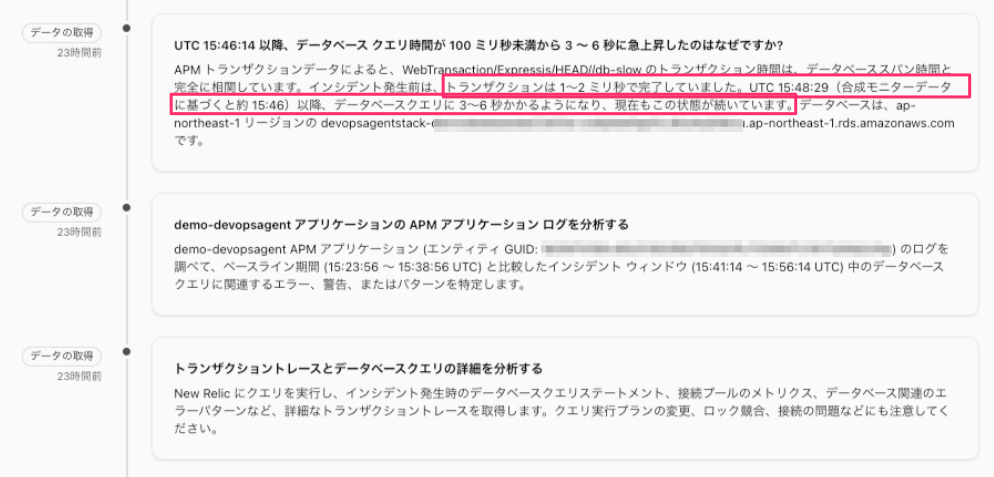 → 特定の情報を抜き出すNRQLを作成するのが運用調査でのつまづきポイントなので、そこを自動で調査してくれるのは非常に嬉しいです。