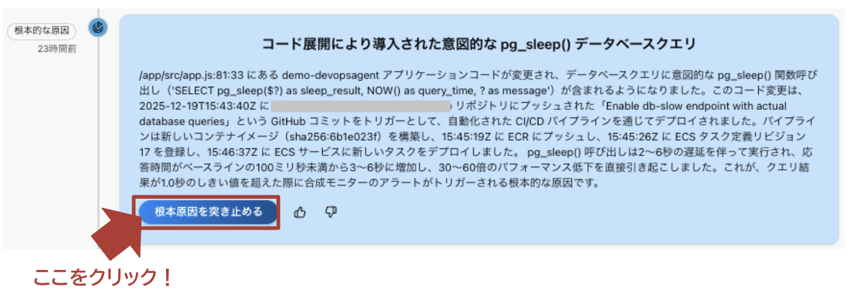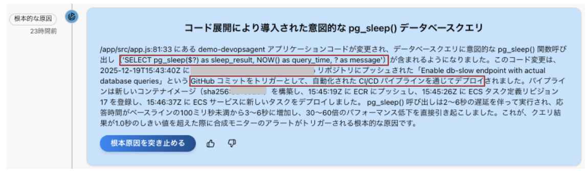 これをDevOps Agentが見抜くことに成功しました。意図的なクエリとはいえ、ちゃんと発見するとはすごいですね。