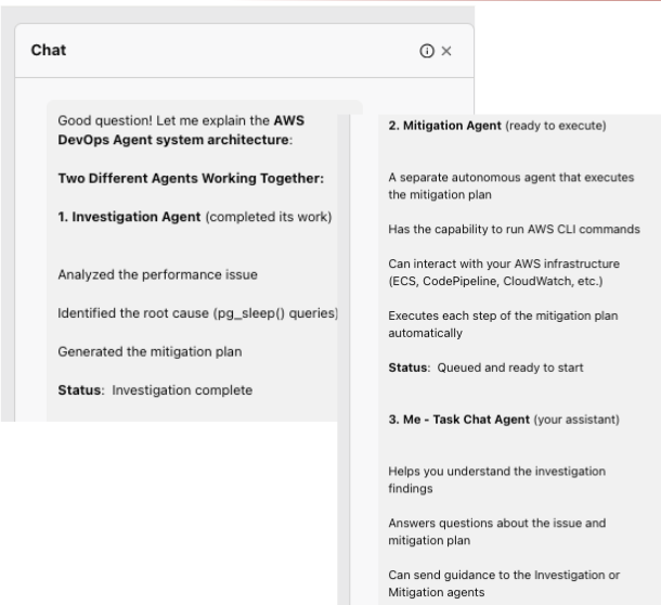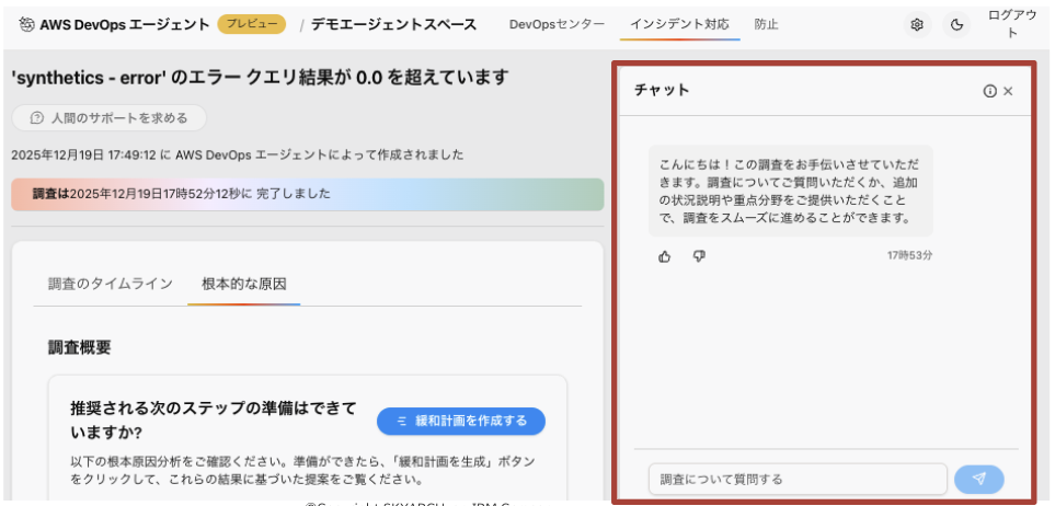 DevOpsAgentの画面右側にはチャットで調査内容に関する質問や追加調査を依頼できるチャットスペースがあります。