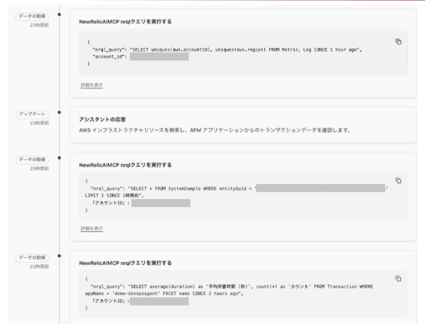 New Relicのデータを検索する上で必要不可欠なクエリ言語、NRQLもMCPと連携して作成・実行してくれます。