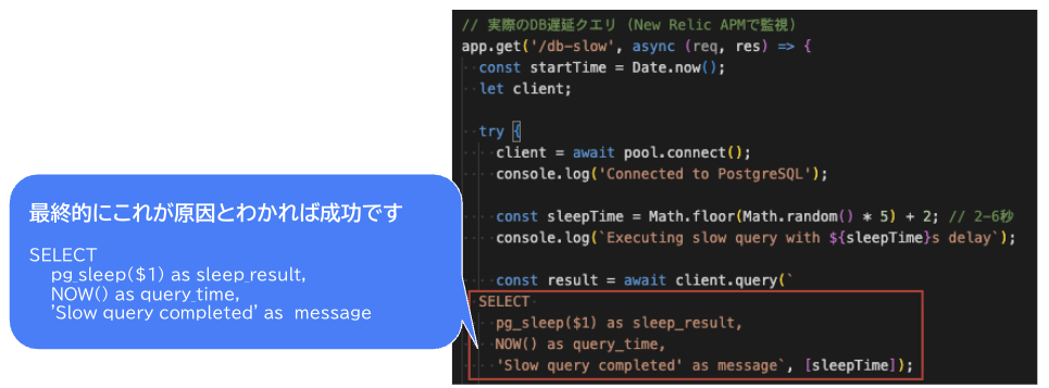 - New Relicの分析: 監視内容から状況を確認、APMのトレース情報を参照し、DBクエリがボトルネックであることを特定