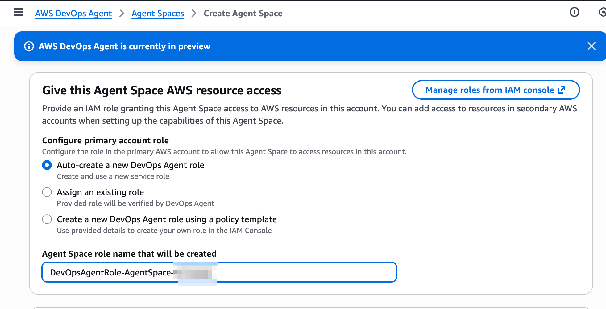 DevOps Agent を作成するアカウント(プライマリアカウント)に付与するロールを選択します。