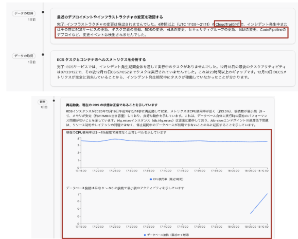 - AWSリソースの相関/デプロイ履歴の調査: CloudTrailやデプロイ履歴を確認し、特定のデプロイ以降に問題が発生していることを発見