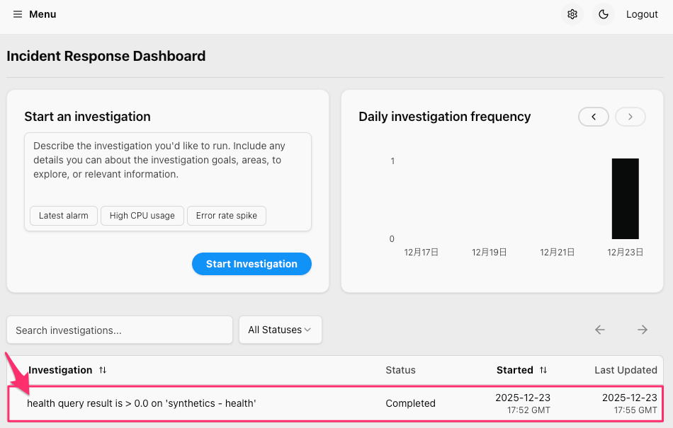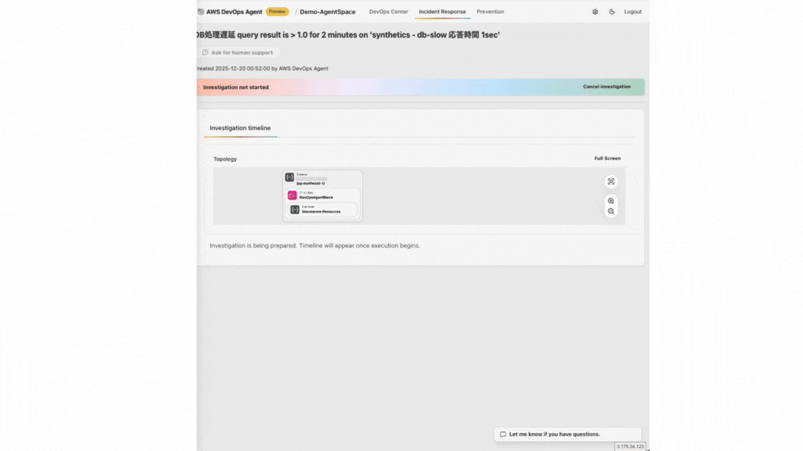 - 調査開始: アラートを受信したDevOps Agentが即座に調査を開始