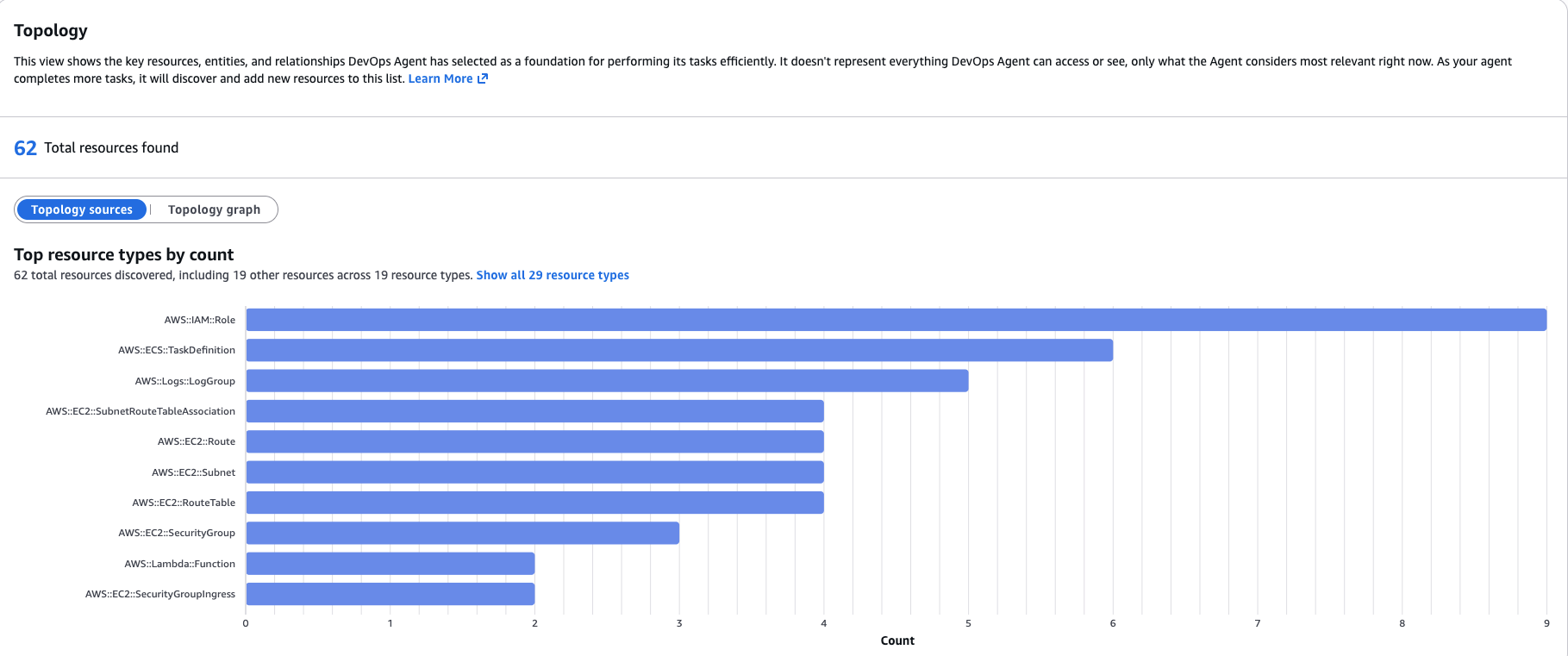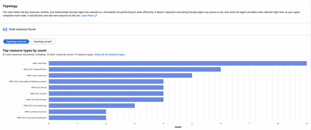 しばらくすると、Topologyの箇所が更新されDevOps Agentにチェックされる、管理対象のAWSリソースを確認することができます。