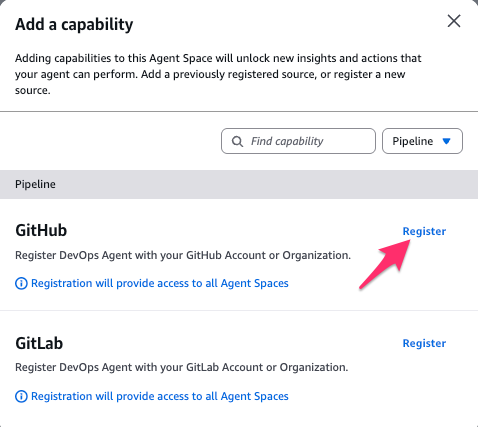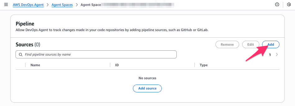 DevOps Agent - Capabilities の画面から、「Pipeline」の「Add」を押下します。