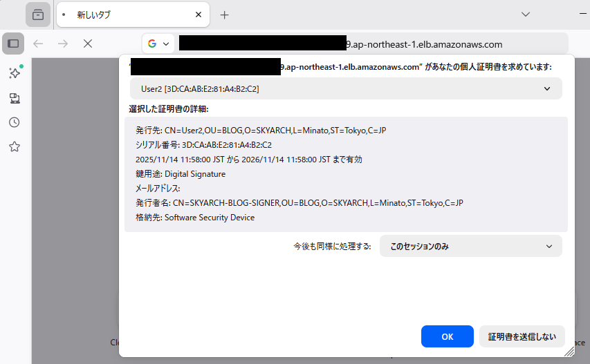 作成したALBにhttpsでアクセスしてみると、ブラウザがクライアント証明書の提示を求めてきました。