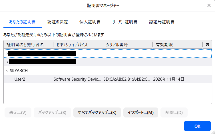 今回はFirefoxを利用しましたので、ブラウザが独自に持っている証明書ストアにインポートしています。