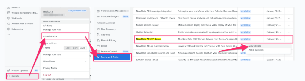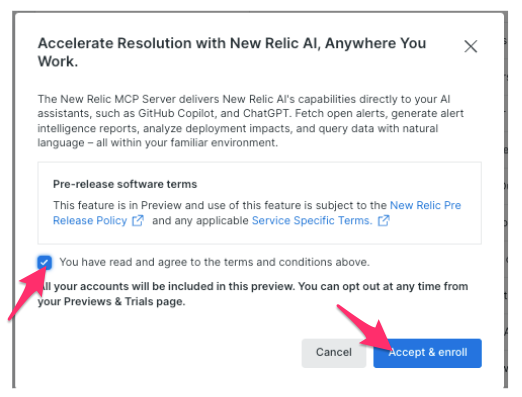 まずはじめにNew Relic AI MCP Server プレビューを有効する必要があります。