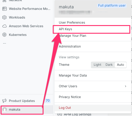 - New Relic UI で、左下隅にあるユーザー名をクリックします。