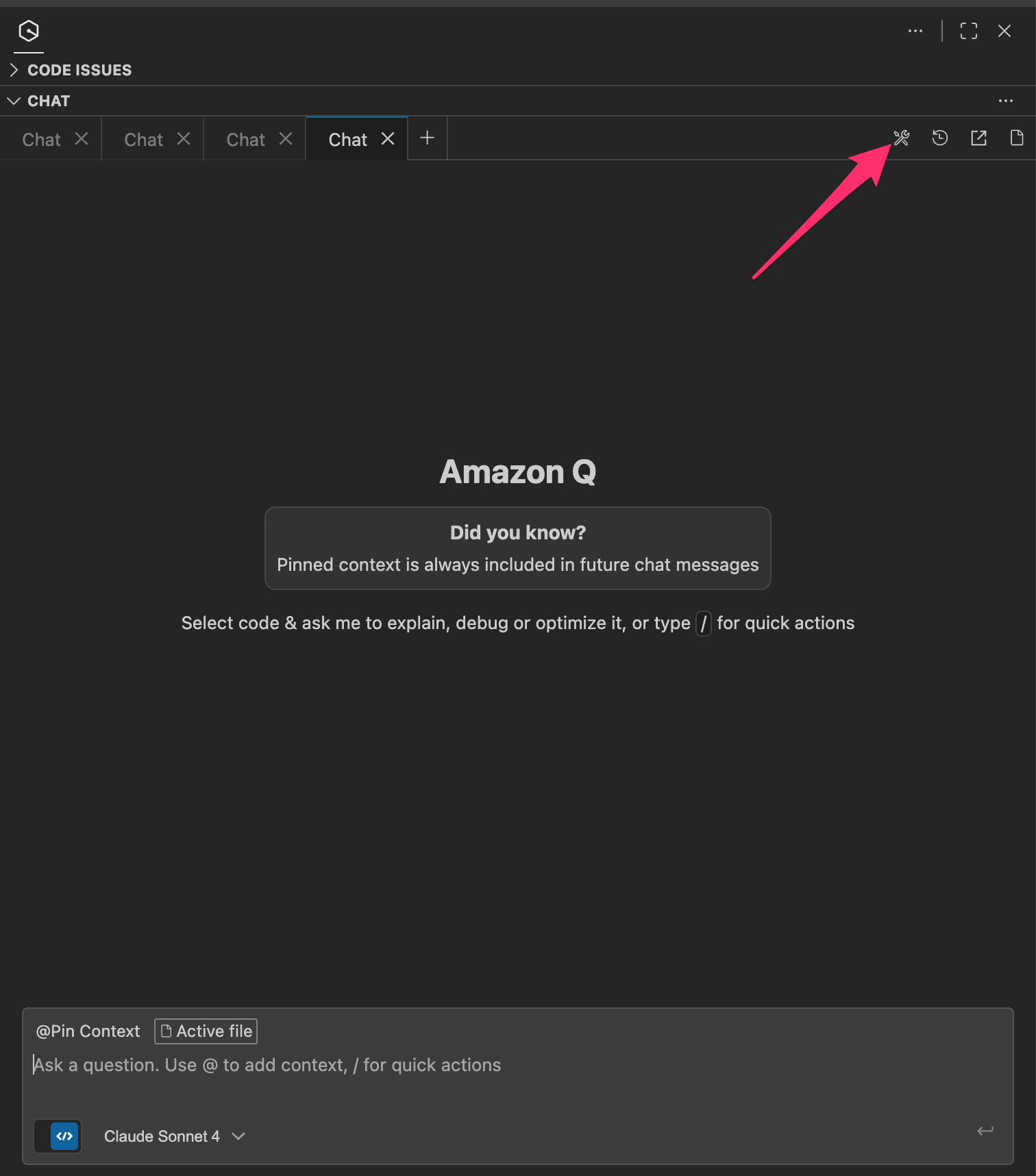 VSCodeでAmazon Qを開いた状態で、「Configure MCP Servers」の設定ボタンを選択します。