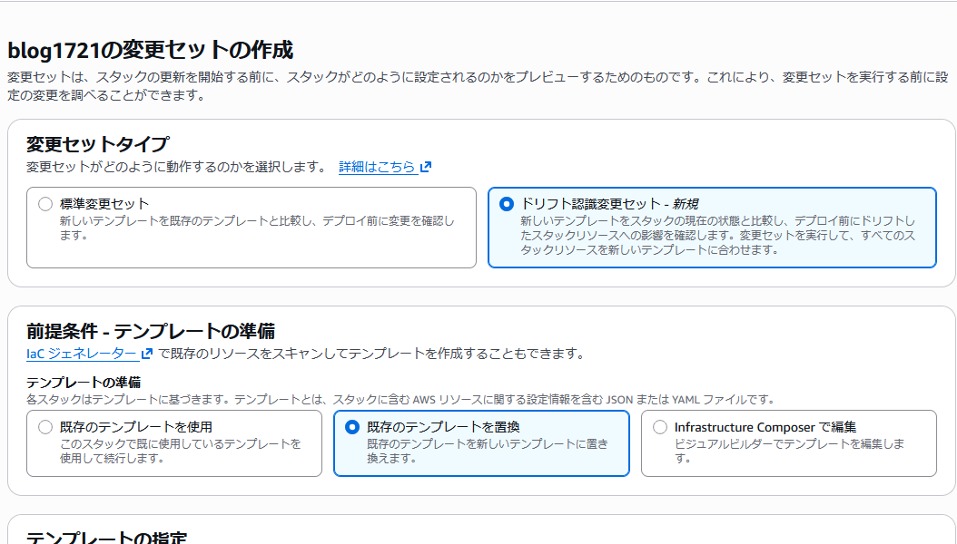 ドリフト認識変更セットとは、CloudFormationでのスタック更新時に、スタックの外で行われたリソースに対する変更を認識して変更セットを作成してくれる機能です。
