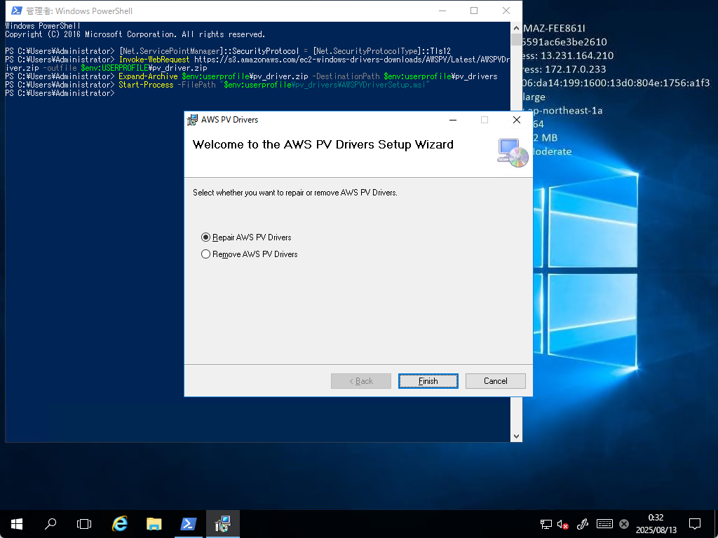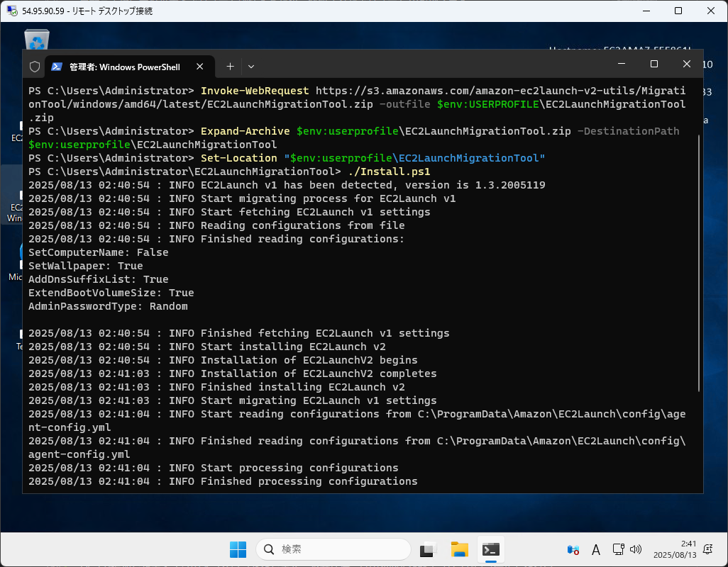 エラーなく完了すれば問題ありません。1234Invoke-WebRequest https://s3.amazonaws.com/amazon-ec2launch-v2-utils/MigrationTool/windows/amd64/latest/EC2LaunchMigrationTool.zip -outfile $env:USERPROFILE\EC2LaunchMigrationTool.zipExpand-Archive $env:userprofile\EC2LaunchMigrationTool.zip -DestinationPath $env:userprofile\EC2LaunchMigrationToolSet-Location "$env:userprofile\EC2LaunchMigrationTool"./Install.ps1