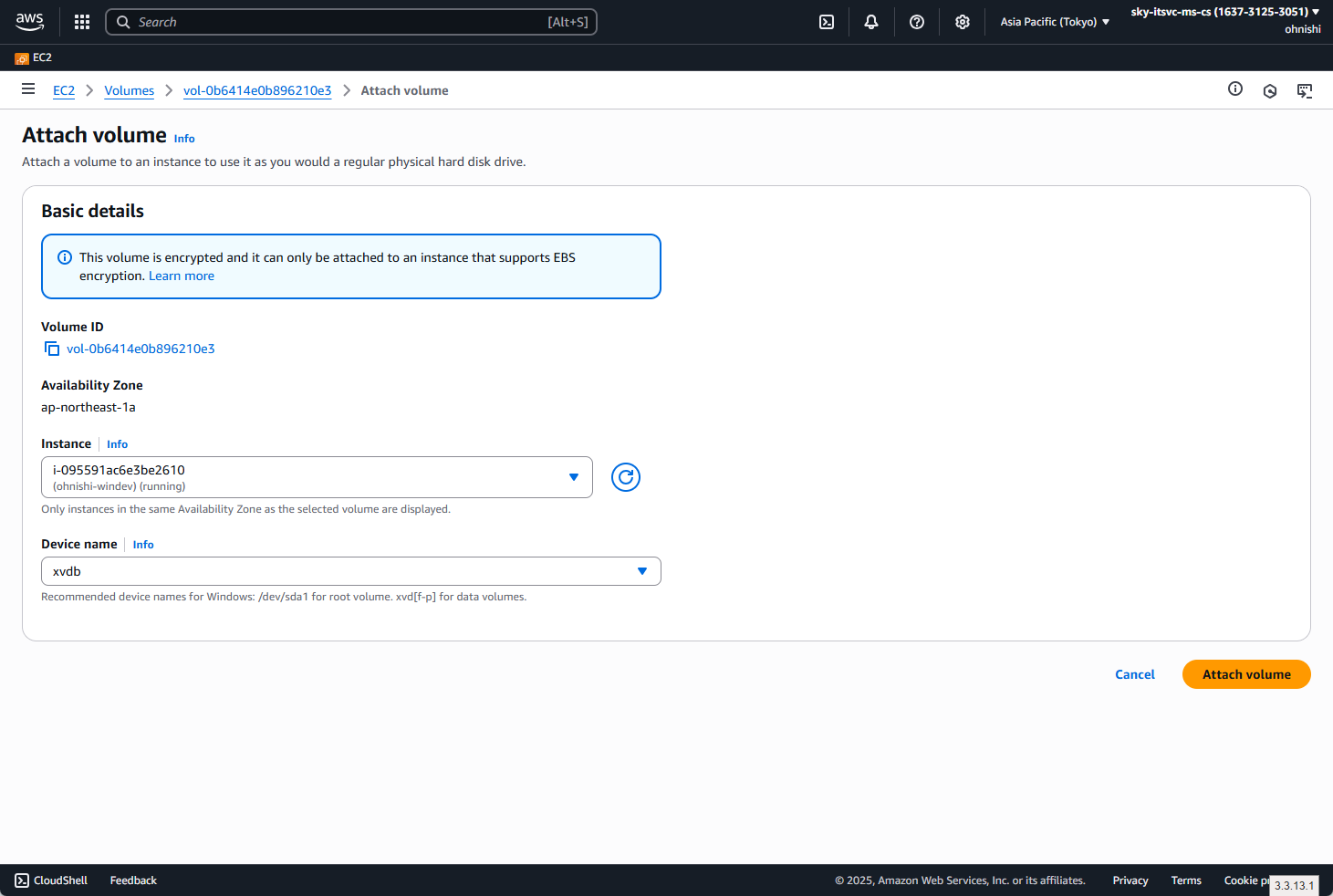 1aへgp3、暗号化有効でEBSとしてボリュームの作成しています。更新完了後にデタッチとボリューム削除するため、作成されたボリュームIDを控えます