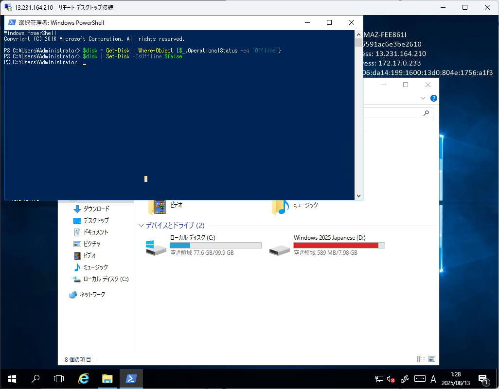 Cドライブしかないサーバであれば、Dドライブとして自動的にマウントされると思います。12$disk = Get-Disk | Where-Object {$_.OperationalStatus -eq 'Offline'}$disk | Set-Disk -IsOffline $false