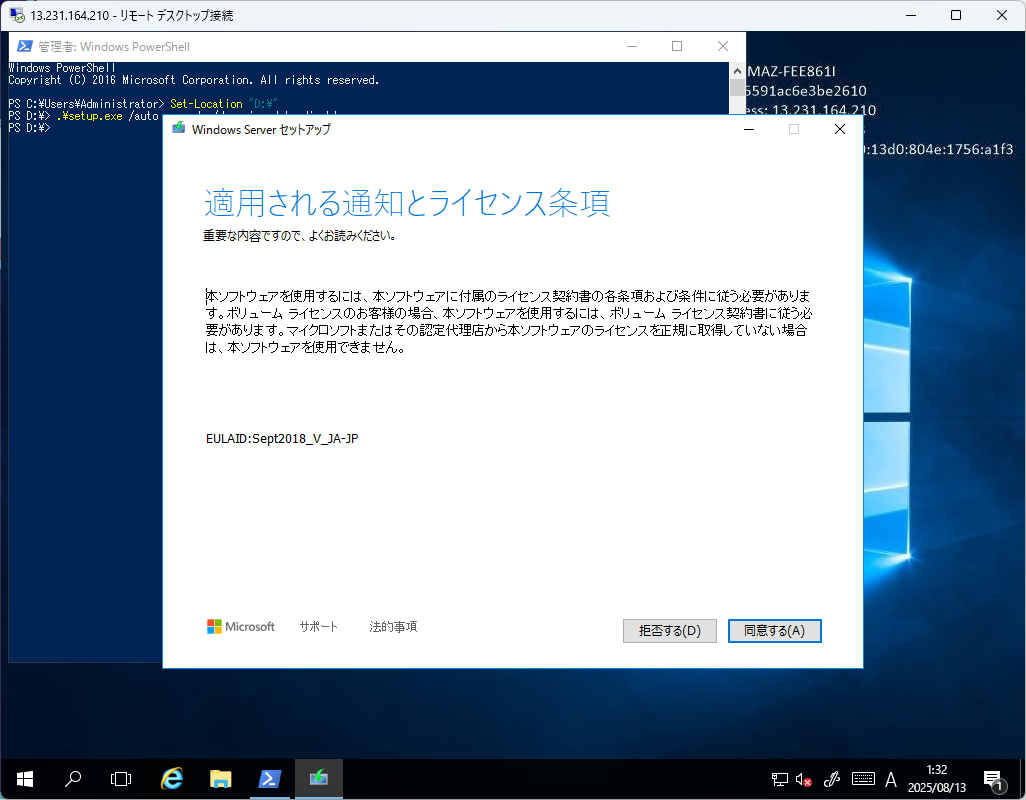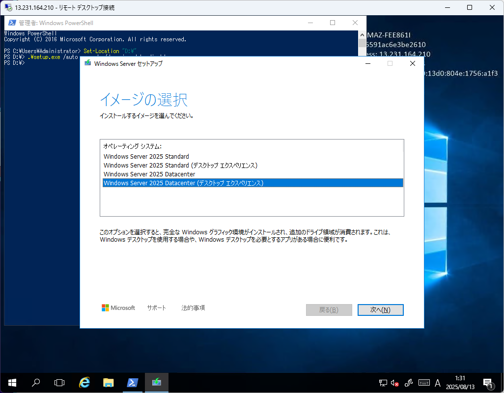 インストールするイメージ(OSのエディション) -> Windows Server 2025 DataCenter(デスクトップエクスペリエンス) ライセンス条項 -> 同意する |