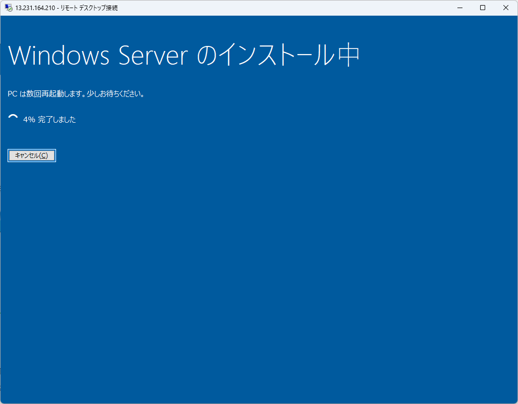 更新中は基本的に利用不能となります。途中でインスタンスの停止や、RDP切断をしないように注意してください。
