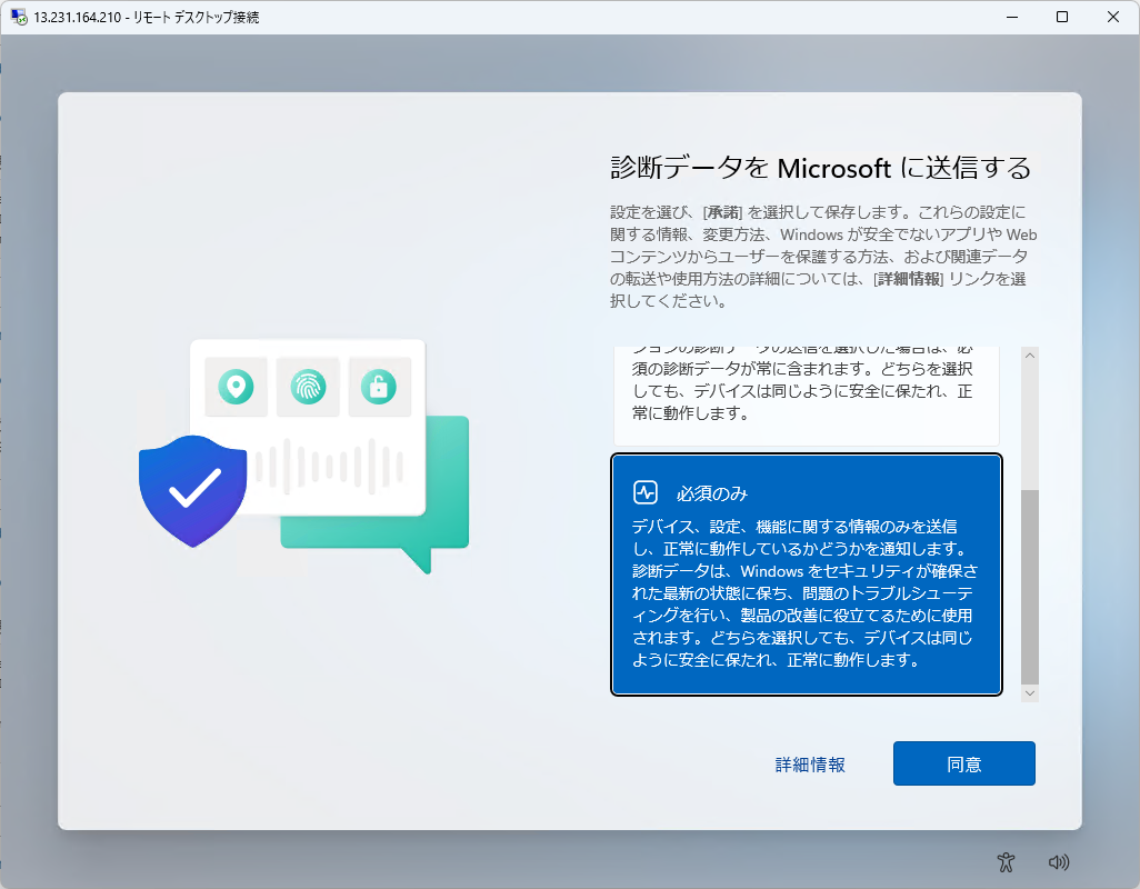 再起動後、Windows Server 2025 では診断データを自動送信するかの確認が表示されます。