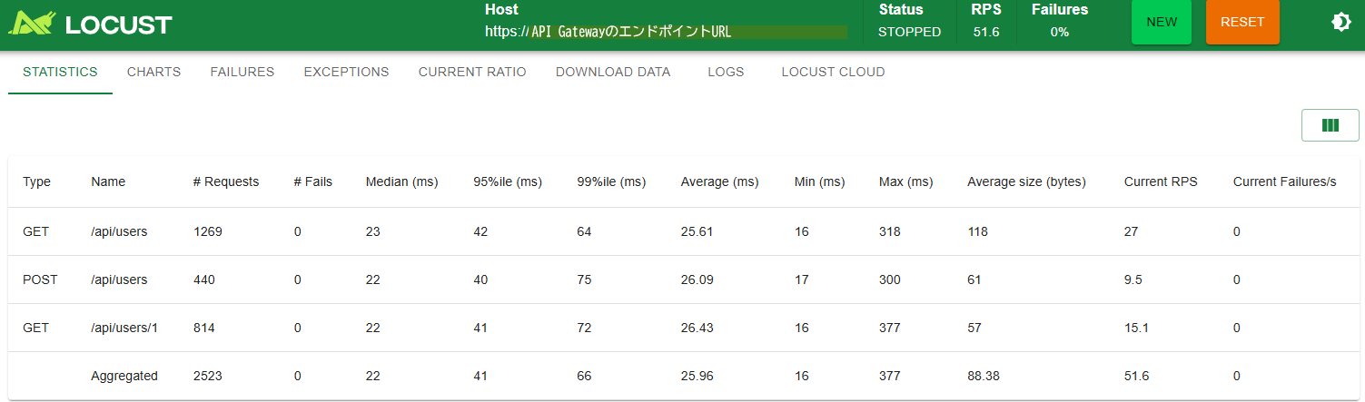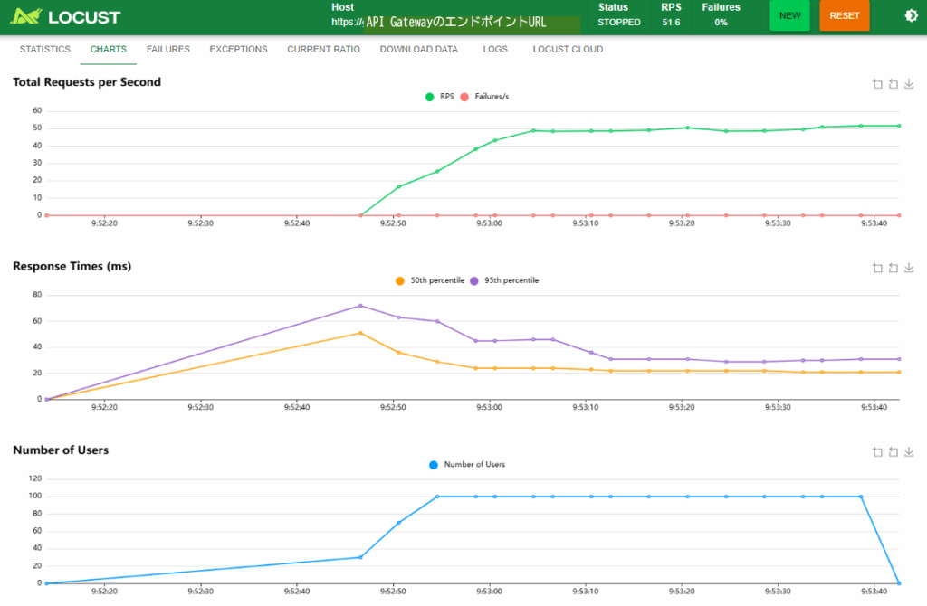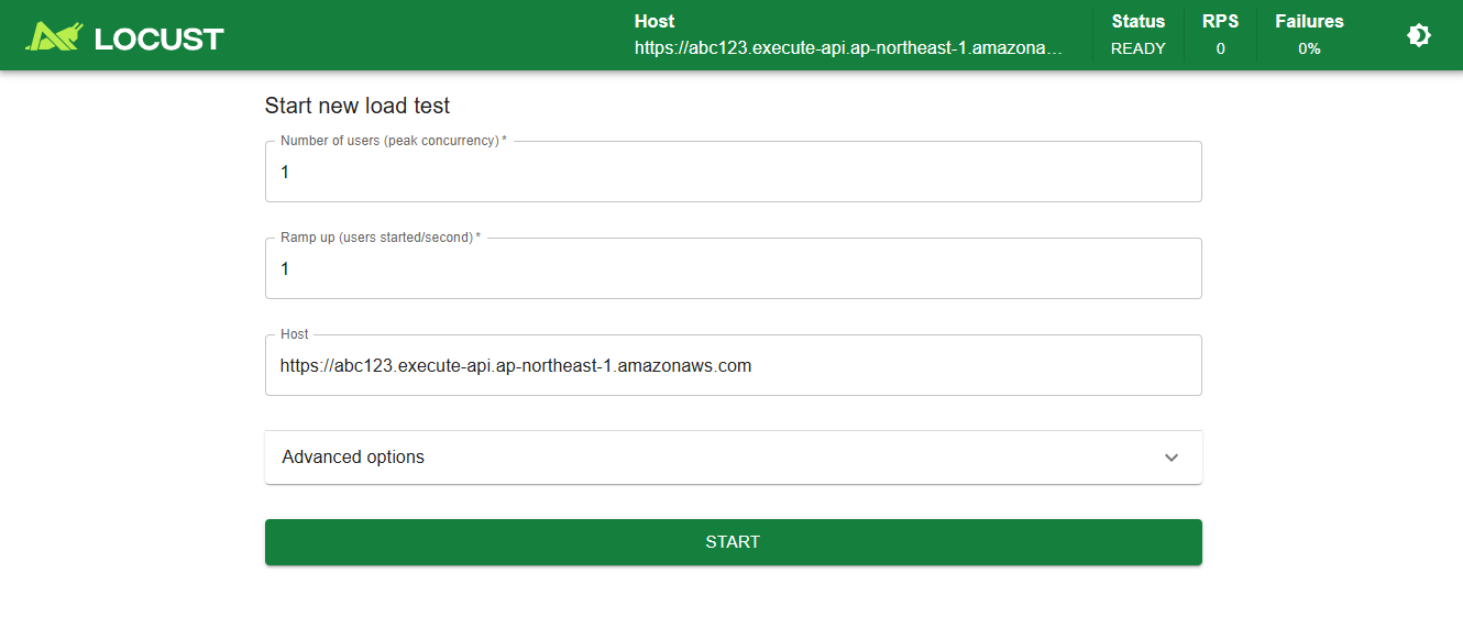 # Dockerイメージをビルド docker build -t locust-api-test . # コンテナを起動(WebUIモード) # 作成したAPI GatewayのエンドポイントURLを指定 docker run -p 8089:8089 locust-api-test --host=https://abc123.execute-api.ap-northeast-1.amazonaws.com # ブラウザで http://localhost:8089 にアクセス |